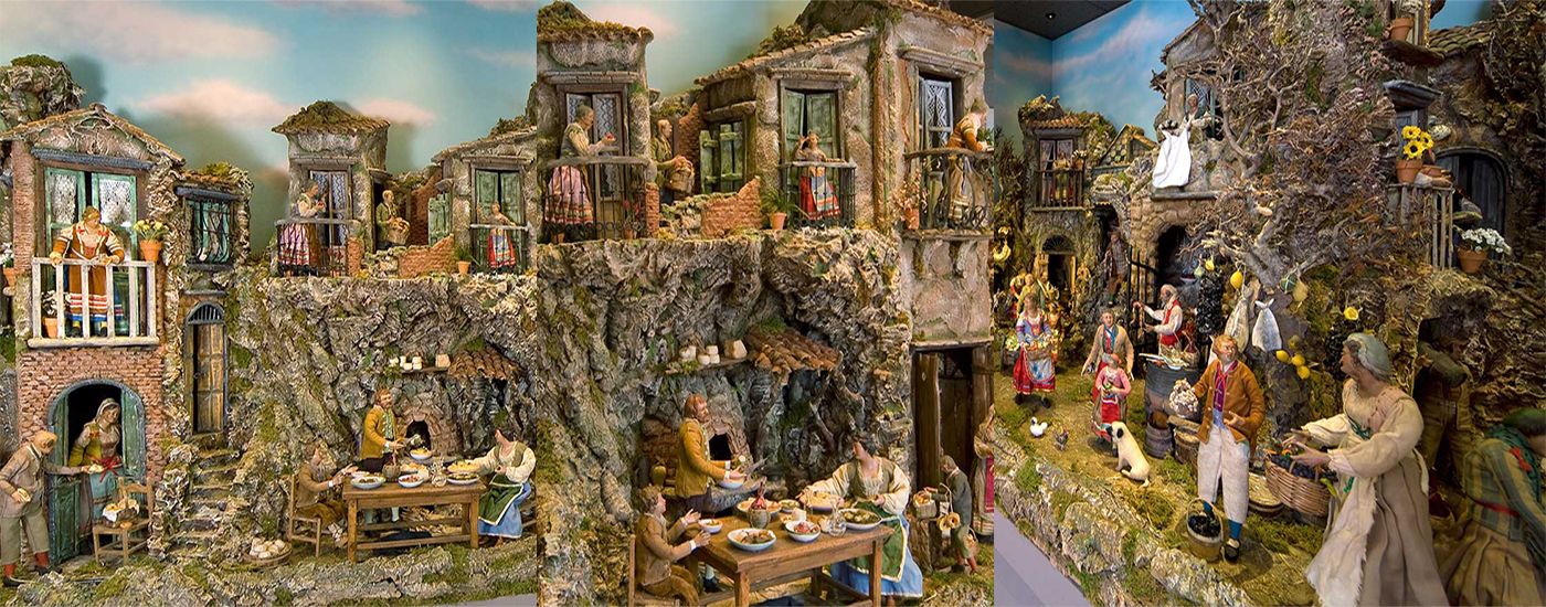 Une partie de la collection de miniatures de notre musée est consacrée à l'art populaire napolitain des crèches. Cette exposition, avec ses scènes typiques de la vie quo- tidienne méditerranéenne, offre une vision unique de la vie des habitants de Naples au 18e siècle. L'art populaire des crèches napolitaines tire ses origines dans la représentation de la Sainte-Famille à la fin du 15e siècle. Charles III, roi bourbon, est à l'origine de l'âge d'or de l'art méditerranéen des crèches. Il a transmis sa pas- sion pour cet art aux citoyens aisés, aux couvents et aux églises. Il a fallu des mois de travail à l'artiste napolitain Mario Capuano pour réaliser à la main nos pièces de collection au troisième étage du musée. Sur quelque 15 m2, il a créé une scène avec ses bâtiments, ses personnages et les centaines d'accessoires, donnant une image authentique de la vie le Naples du 18e siècle. La famille Capuano se consacre avec passion à l'art de la création de crèches de- puis 1840. Parmi ses dernières œuvres importantes, on compte la crèche de l'église de pèlerinage de San Giovanni Rotondo et celle du roi d'Espagne Juan Carlos.